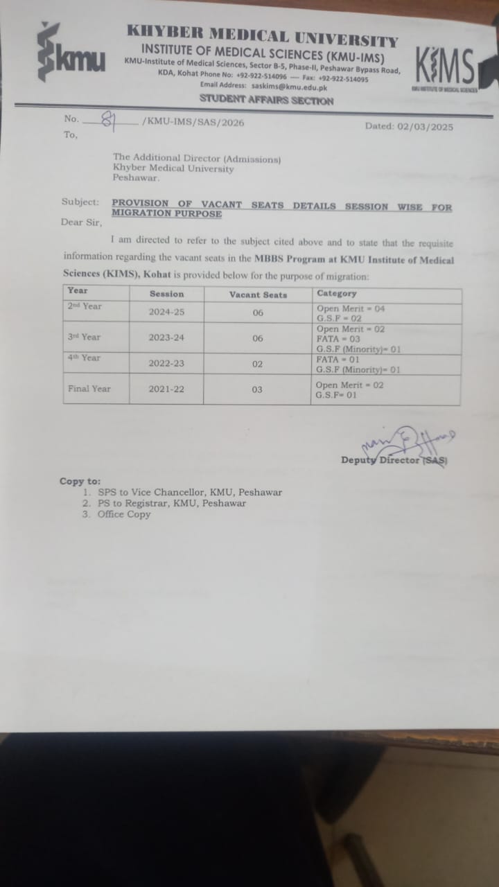 KMU Institute of Medical Sciences (IMS), Kohat, has seen dedicated leadership over the years. The former principal served with commitment, helping to establish the institute’s strong academic foundation and maintaining discipline and high standards. Under their guidance, the institute gained recognition for quality medical education and research. The newly appointed principal has taken charge with a vision for further growth and modernization. They aim to enhance student facilities, improve teaching methods, and strengthen clinical training. Their leadership brings new energy, focusing on innovation, digital learning, and academic excellence. Both the past and present principals have played a vital role in shaping KMU IMS Kohat into a leading medical institution. These principals have also struggled and worked tirelessly to achieve a new building for the institute within a short period, reflecting their dedication and determination toward the betterment of the institution.
